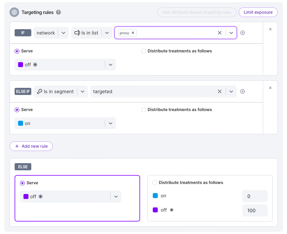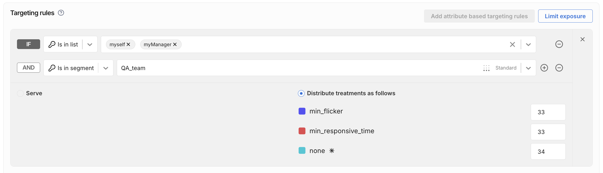 Click Add attribute based targeting rules to assign individual users or segments to a selected treatment or percentage distribution. Within attribute based targeting rules, you can: -