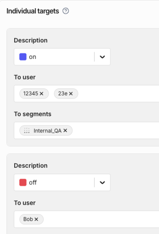 Individual targets are evaluated in order. For example, if Bob is a user ID in the Internal_QA segment, then Bob will get on even though you’ve specifically assigned that key off.