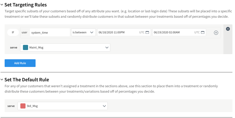 Using a targeting rule and passing the system time: - You can turn the flag onoroffat a specific time, for a subset of users or for all users.