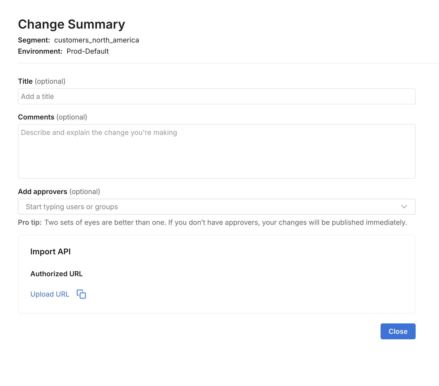 On the Change summary page, click Save to generate an upload URL.  The upload URL will time out after 5 minutes, and the Large segment change request will be automatically withdrawn if the upload URL was not used.