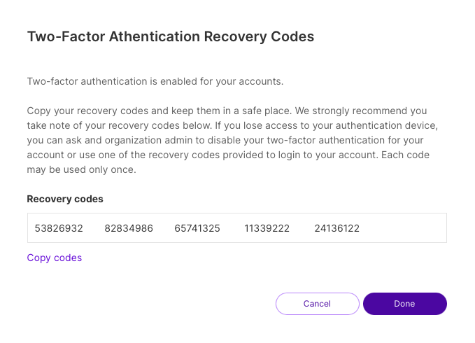 While the recovery codes allow you to access Harness FME in an emergency, you should contact your team's Administrator to disable two-factor authentication and then complete the setup process again. If you do not have access to the recovery codes, your team's administrator can disable two-factor authentication for your account.