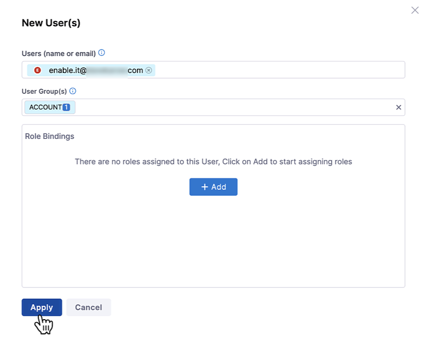 Disregard the Role Bindings field and the “There are no roles assigned to this User”message it displays. Your new user will inherit role bindings from the group you selected above.