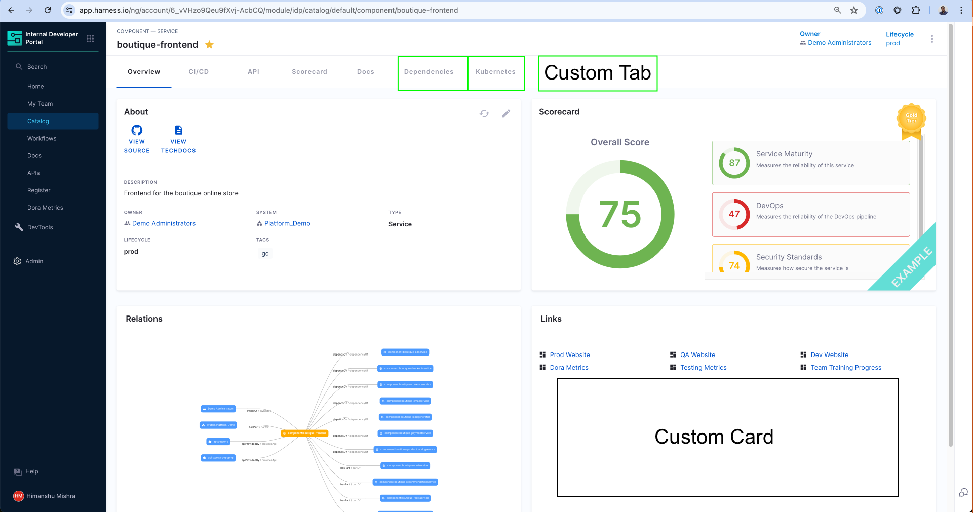 Whenever you register an entity in your software catalog, you can view all its details from the Catalog Entity page in your Harness IDP UI. Every section on the entity page is uniquely designed to present the most relevant information for the specific type of entity you're viewing.
