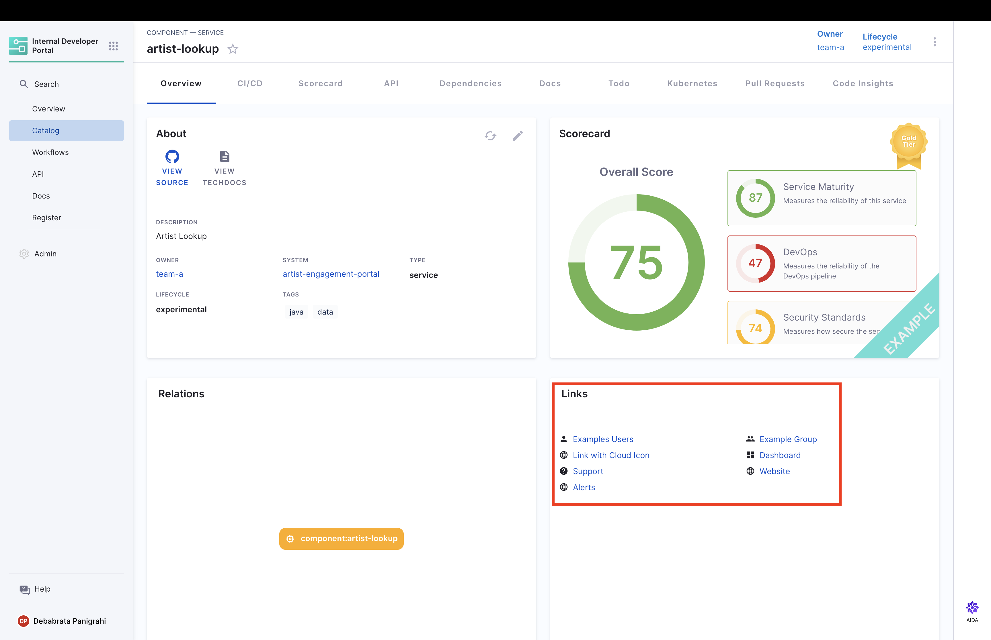 Here’s how "Links" show up in your Catalog entity details page. The Links Card serves as a navigational tool, and these links can point to anything. Here are some examples: