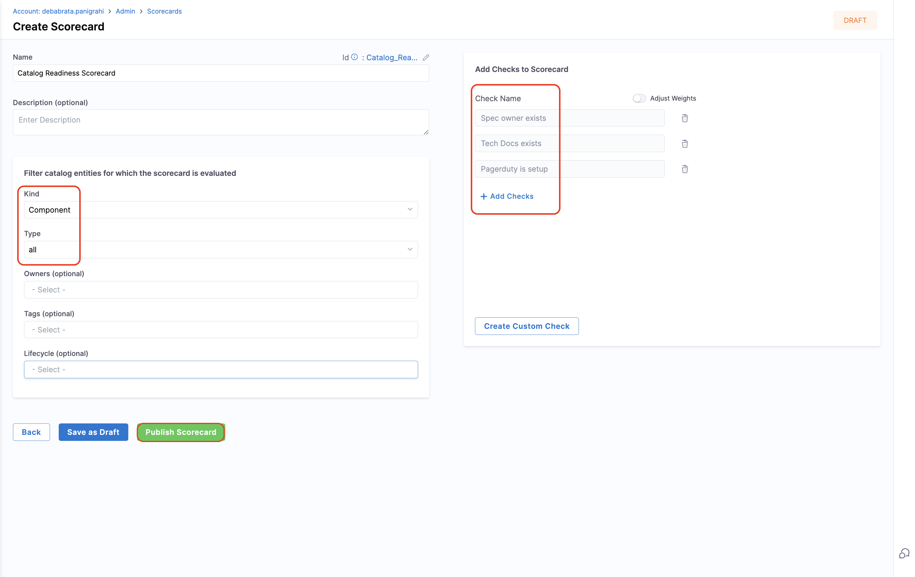Now Publish the Scorecard. Once a scorecard is published, it is listed on the Scorecards Overview page, which provides an aggregated view of all scorecards that are either enabled or in draft for the account.