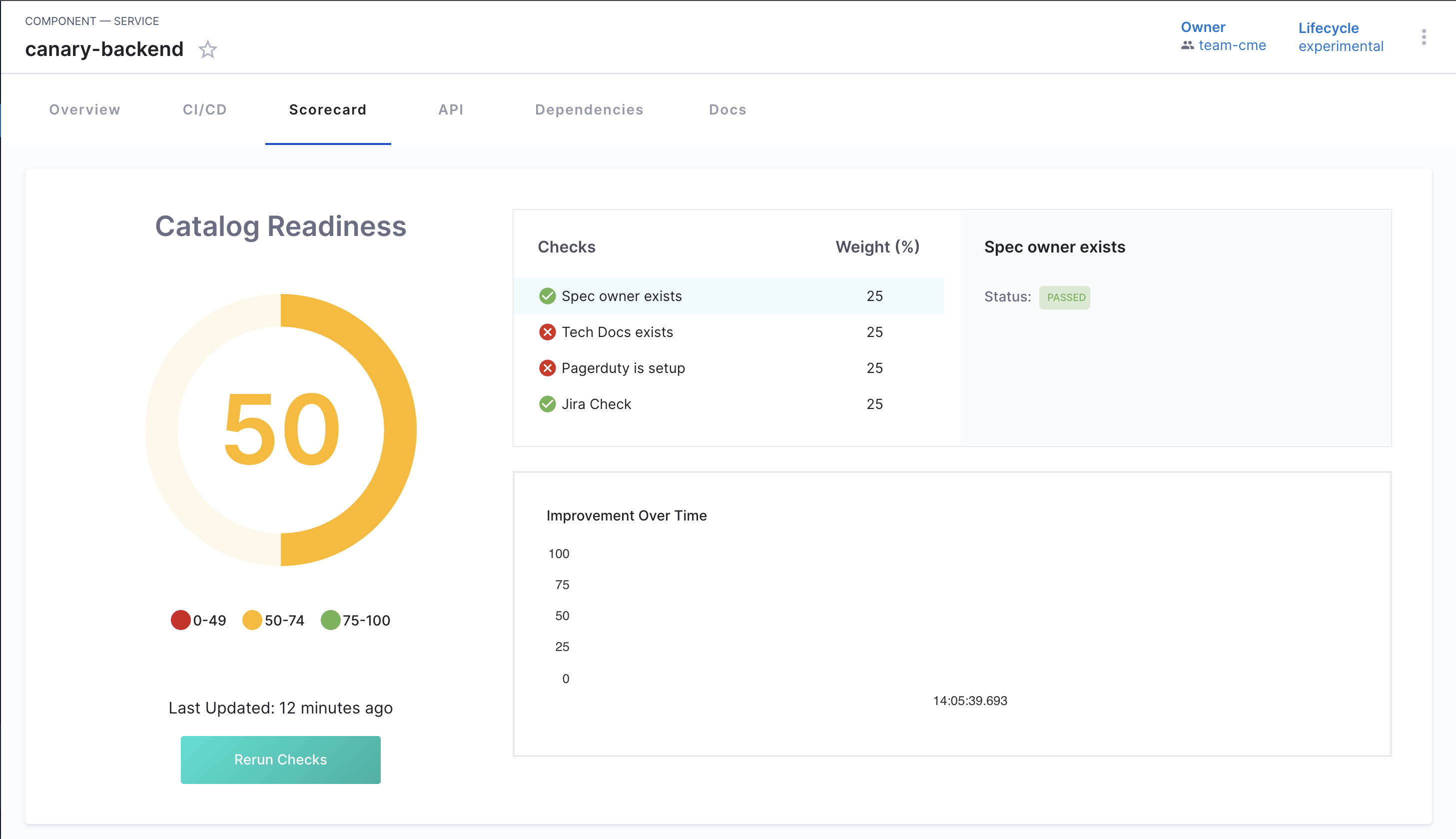 Metadata Completeness: The scorecard assesses if required fields like name,ownerandannotationsare present in the component'scatalog-info.yaml. These fields enable proper categorization and ownership tracking.
