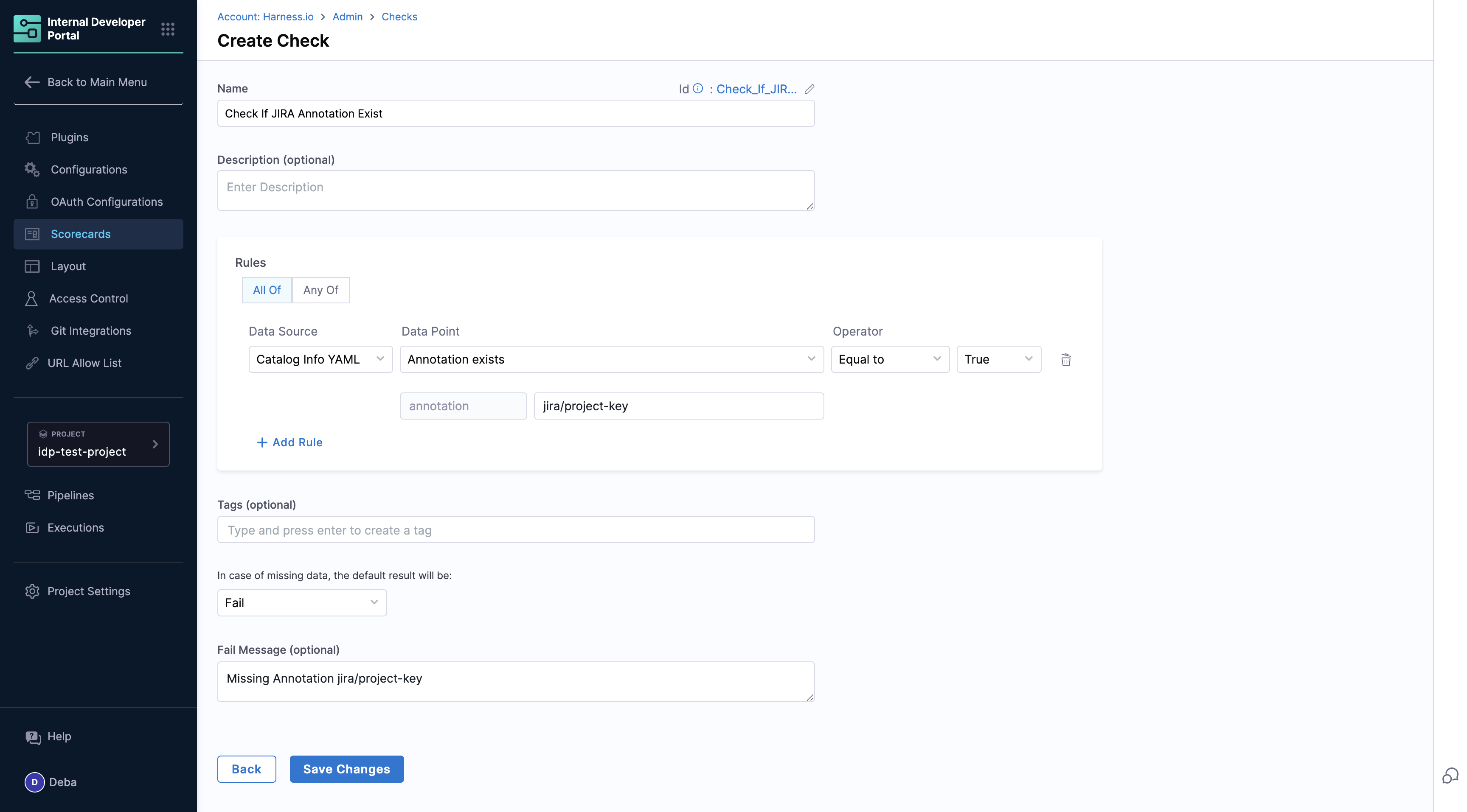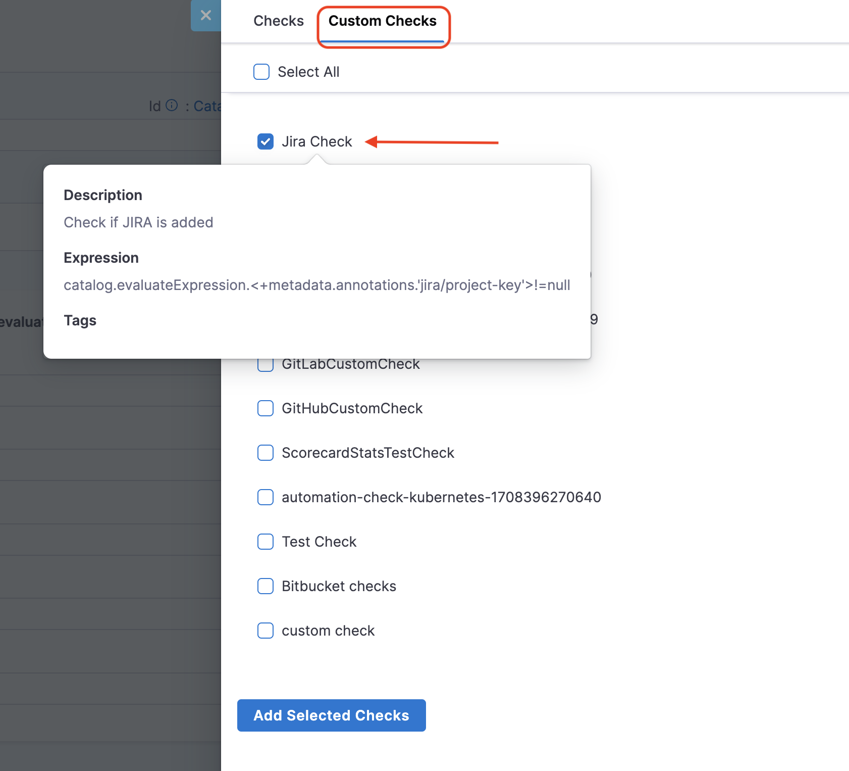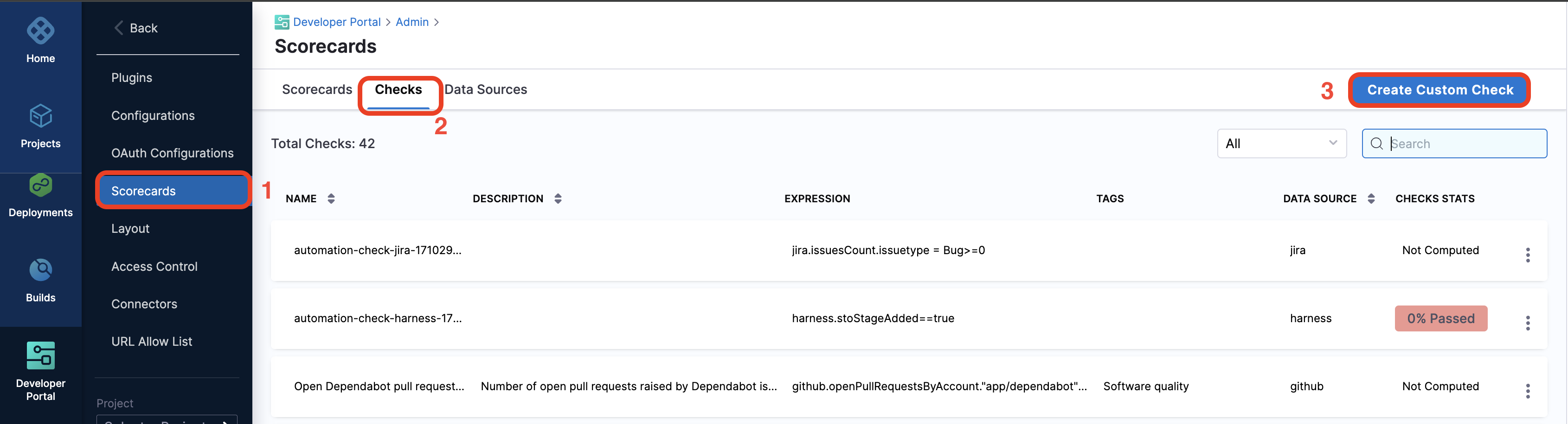 Now that the scorecard has been created, let’s update it by adding a Custom Check to track Jira configurations (whether the Jira Plugin annotation exists or not). Custom checks are user-defined checks that can be created in addition to the default checks provided. These are built using the available data sources and data points.