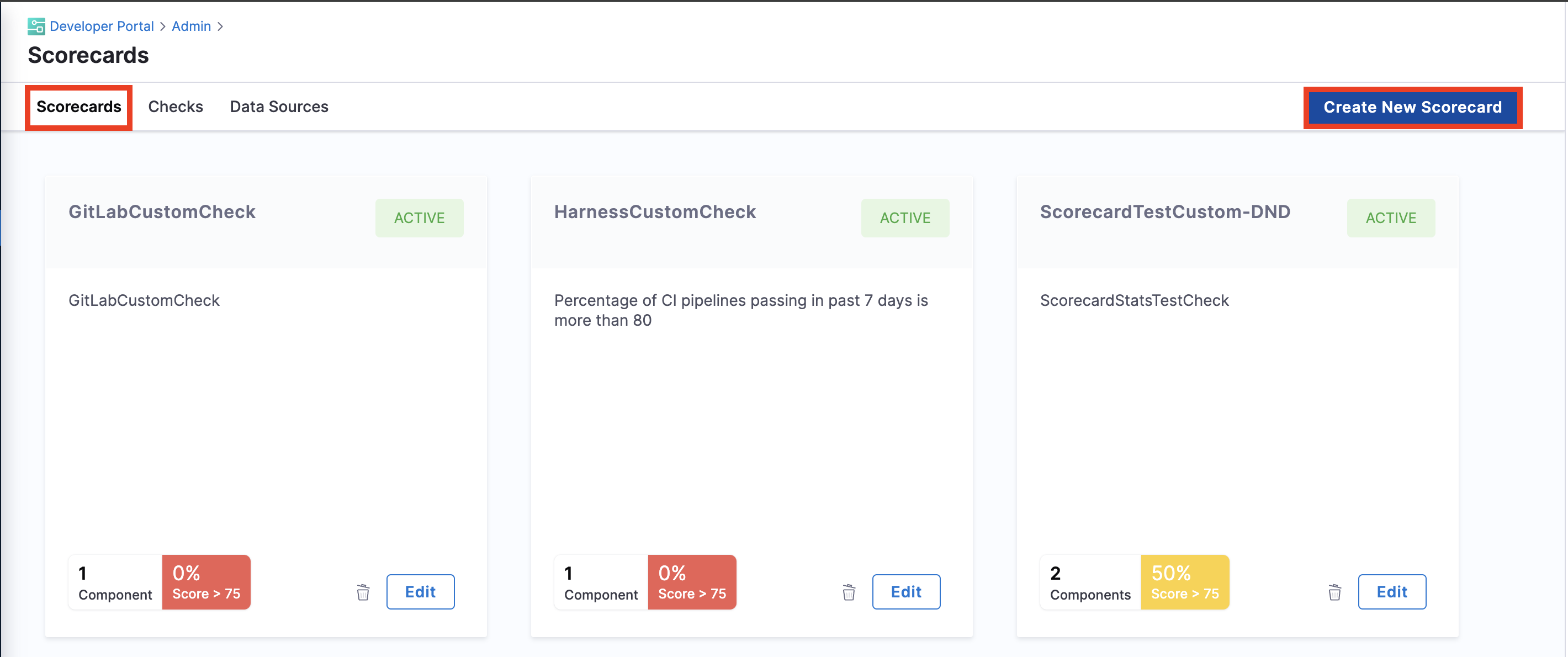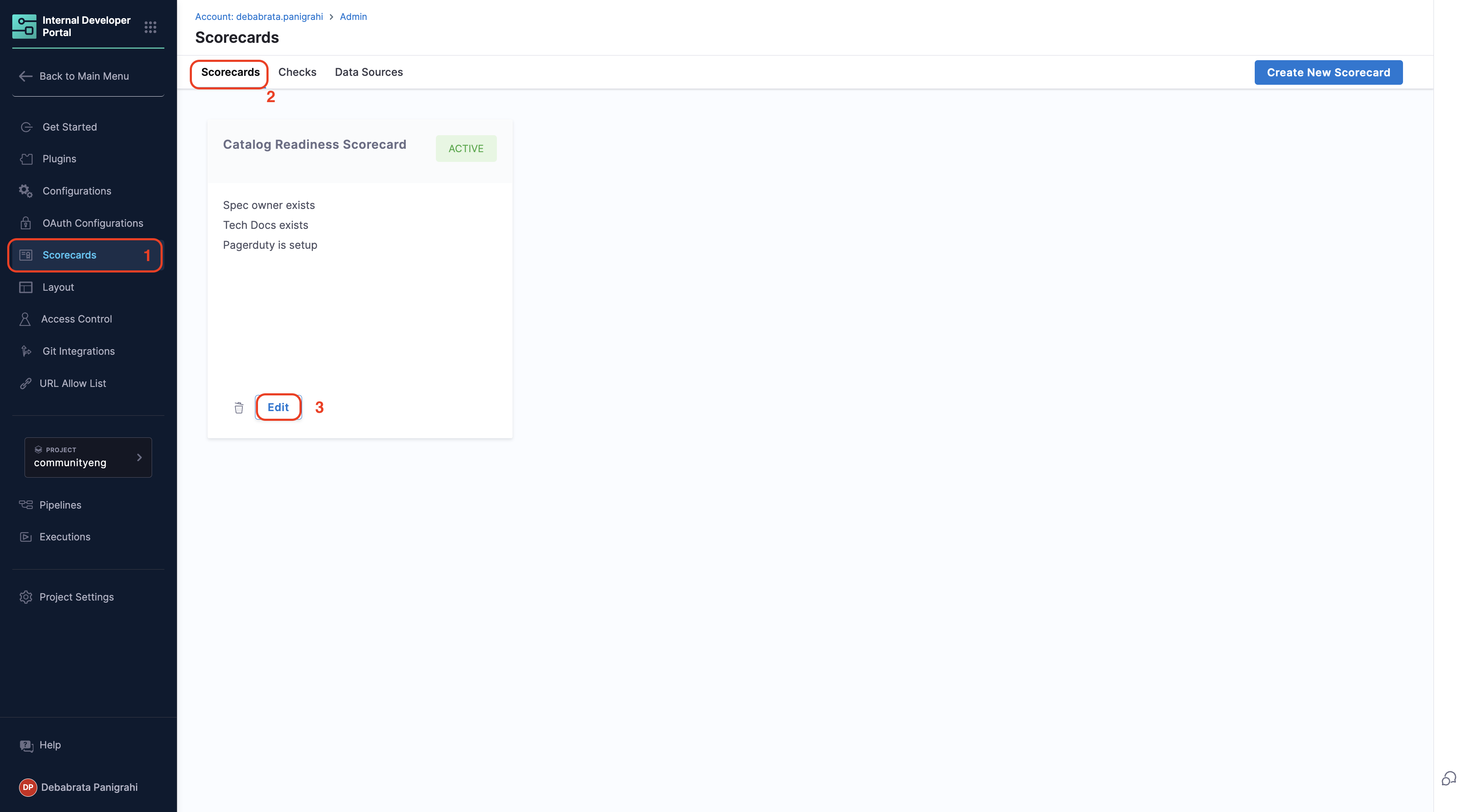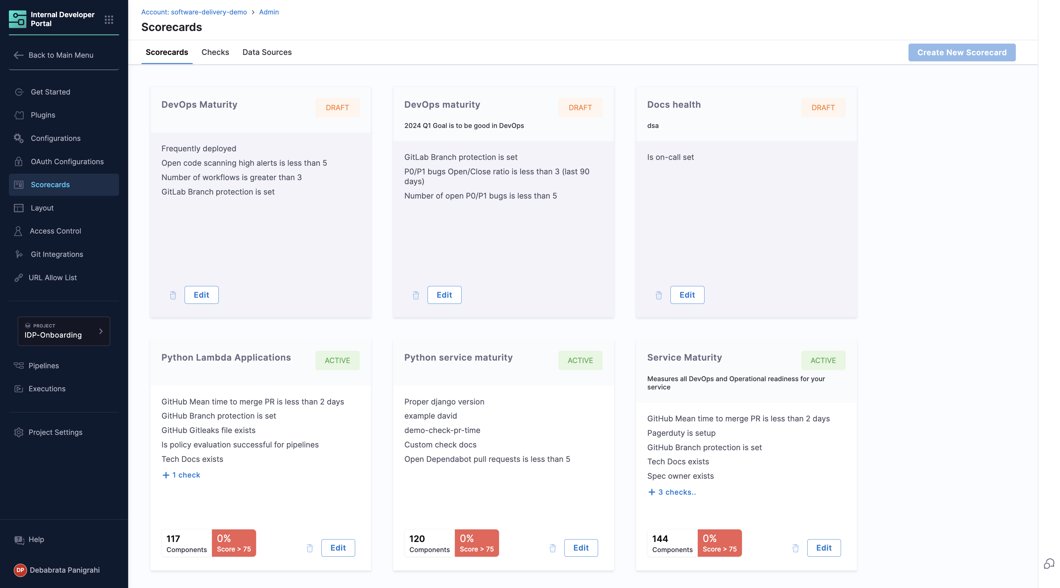 Make sure you have the IDP Admin or IDP Platform Engineer role assigned to you with permissions to view, create and edit scorecards