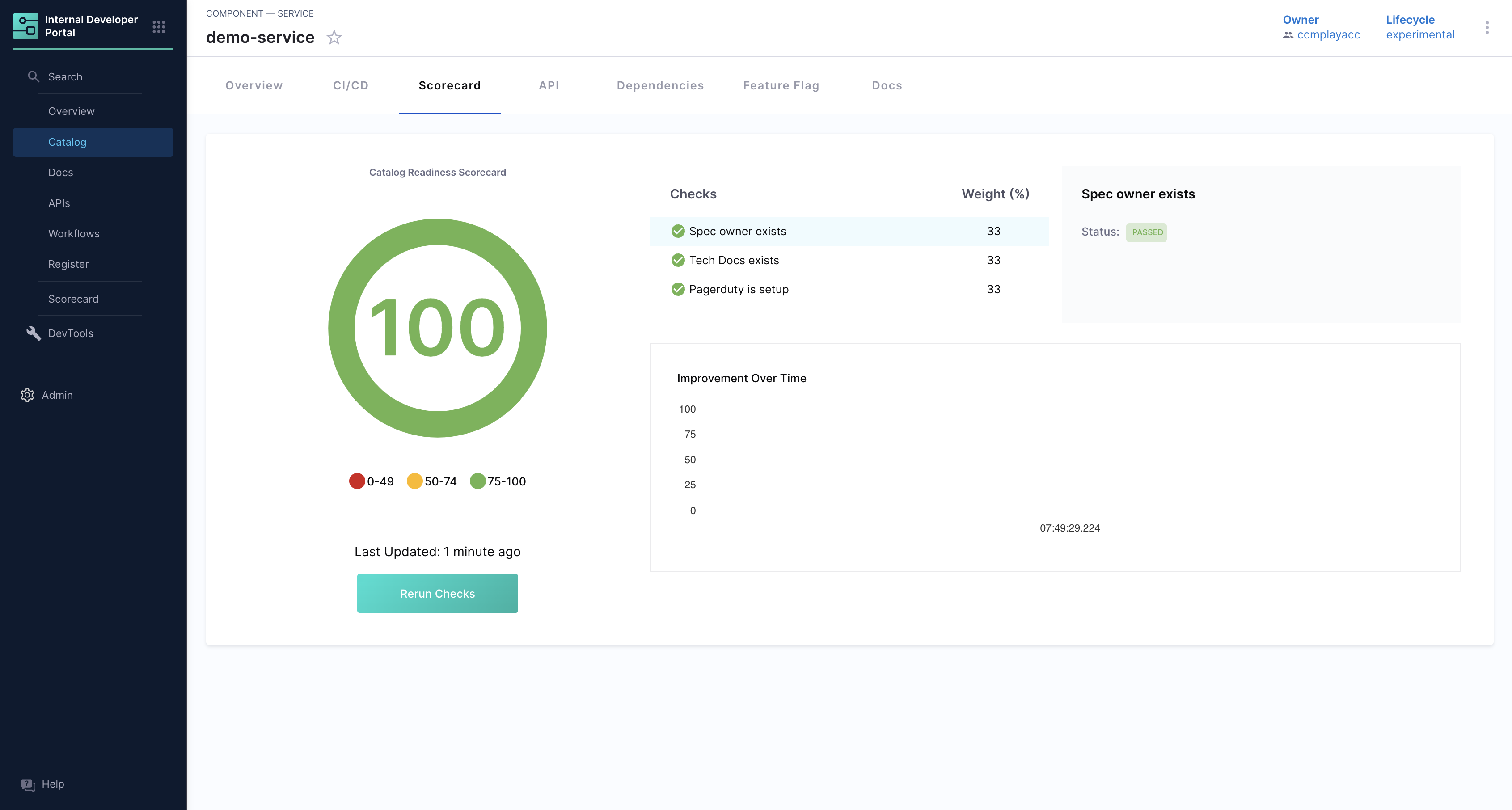 The Catalog Readiness Scorecard evaluates the completeness and quality of metadata for software components within the catalog. It helps teams ensure that their components adhere to best practices, meet organizational standards, and provide the necessary information for discoverability, integration, and automation.