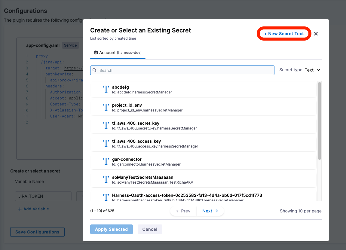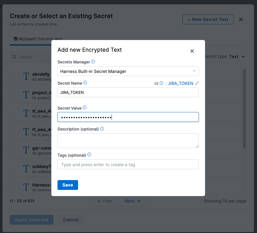 - Create secret in Harness to store API token: Once token is generated, click on the “input field” next to JIRA_TOKENand you will see a pop-up to create or chose existing secret