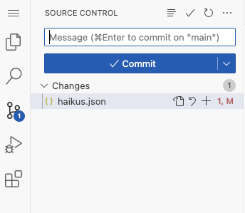 To stage your changes, click +next to thehaikus.jsonfile, or next to Changes if you've changed multiple files and you want to stage them all.