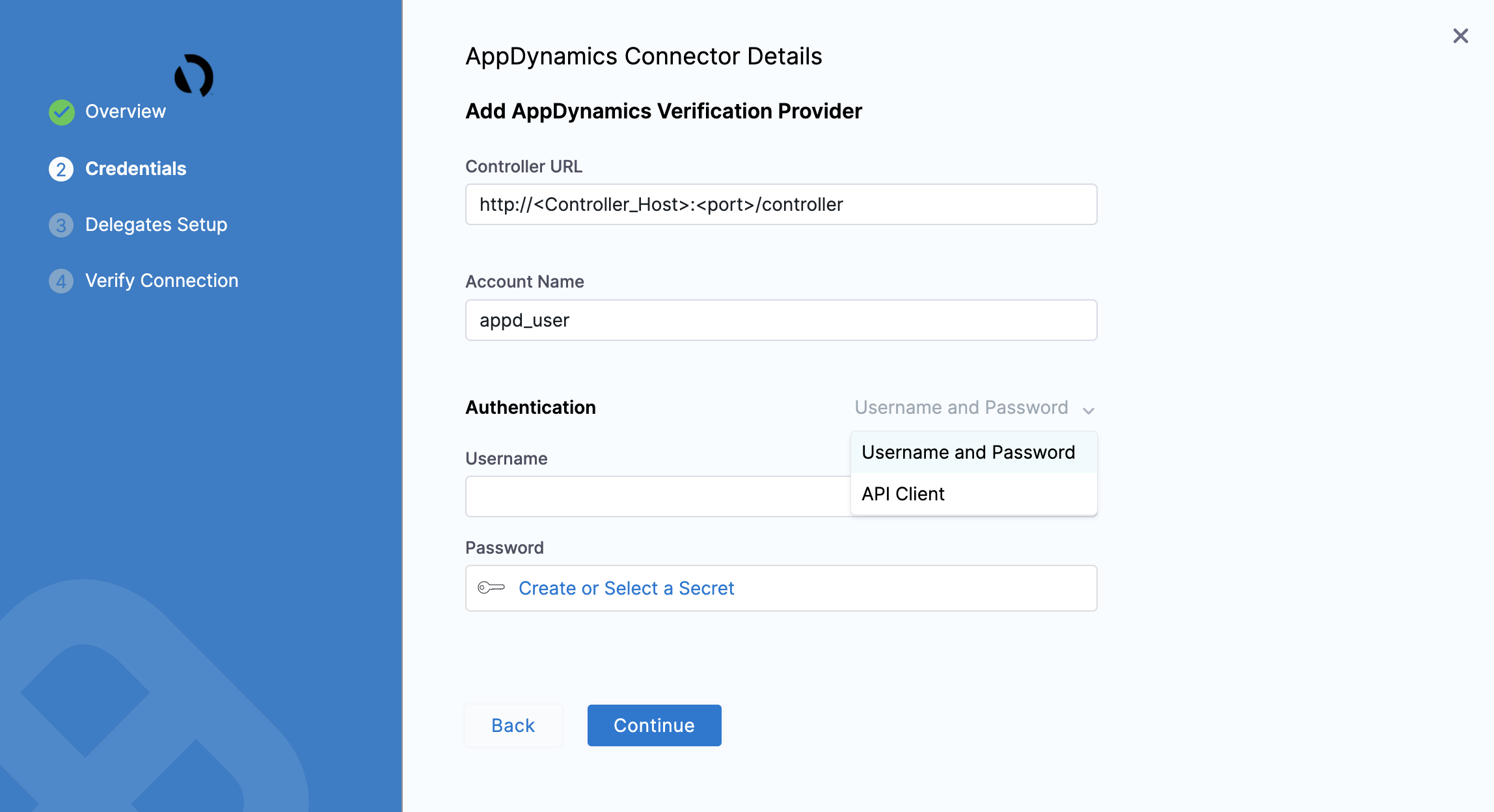 • Username and Password: In User Name and Password, enter the credentials to authenticate with the AppDynamics server. In Password, you can choose Create or Select a secret.