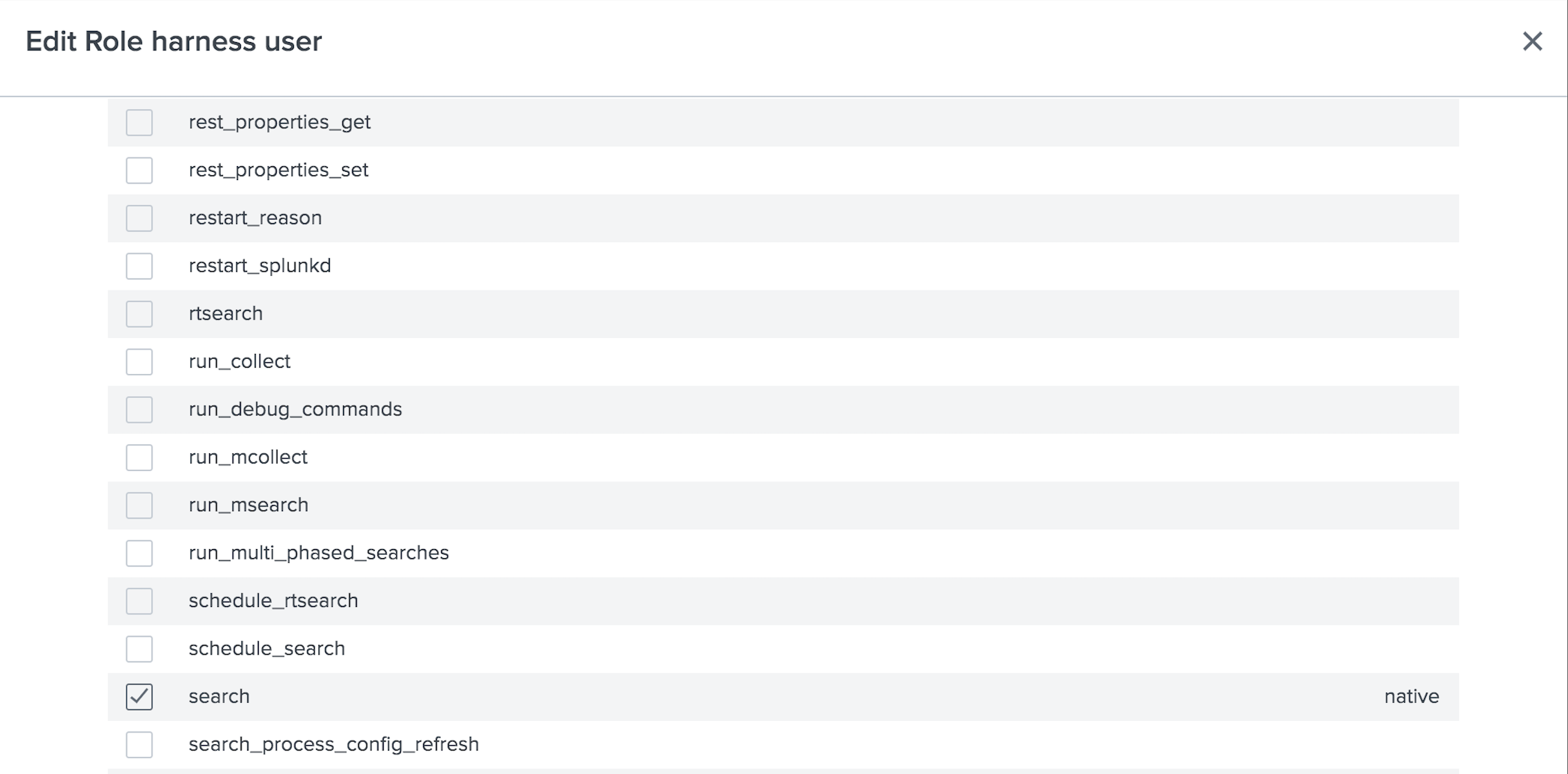 In the following example we've created a new Splunk role named Harness User, and assigned it search capability: