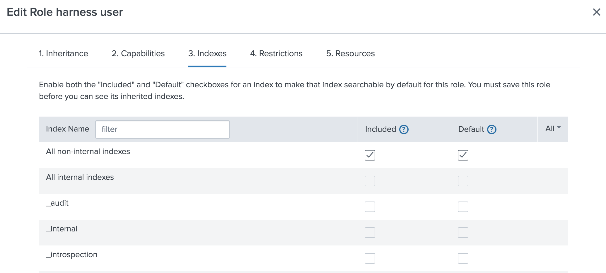 We've given this role access to All non-internal indexes. However, we could restrict the access to only the few relevant indexes: