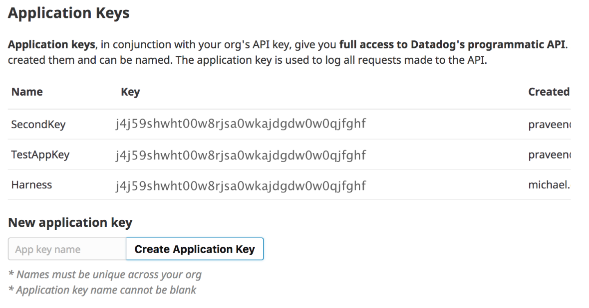 1. In Application Keys, in New application key, enter a name for the application key, such as Harness, and click Create Application Key.