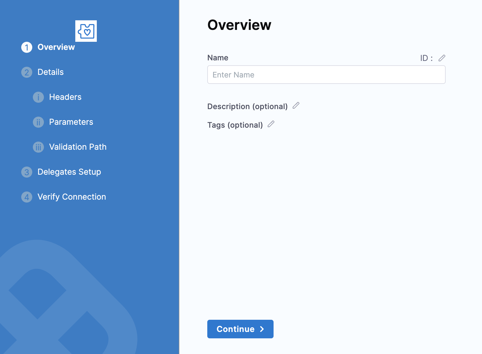 5. In the Overview tab, enter a name for the connector, an optional description, and a tag, and then select Continue. If you are going to use multiple providers of the same type, ensure you give each provider a different name.