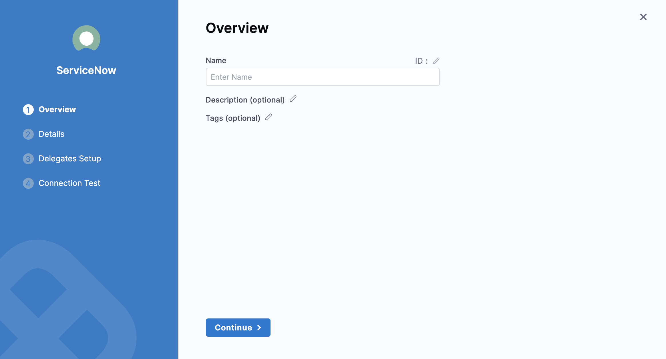 Enter Name for this connector. You can choose to update the Id or let it be the same as your ServiceNow connector's name. For more information, go to Entity Identifier Reference.