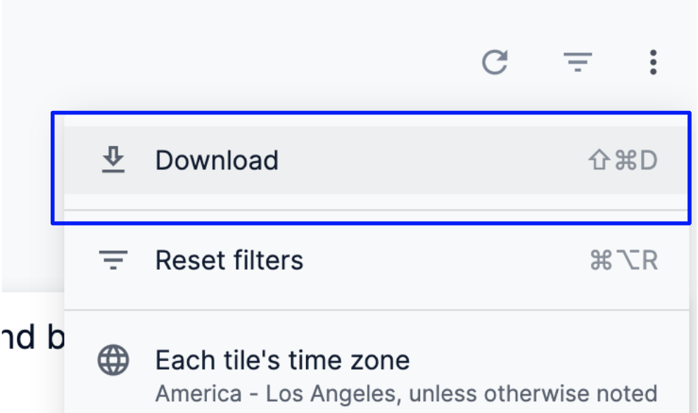 - To download the entire dashboard, select Download from the dashboard’s three-dot menu.
