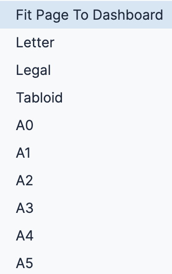 Select an option from the Paper Size drop-down menu. The Fit Page to Dashboard option is the default; it sizes the PDF to match the layout of the dashboard on the screen. Other paper size options size the PDF to match a standard paper size and fit the dashboard within it. Depending on the layout of the dashboard, large visualizations or groups of overlapping tiles may need to be resized to fit on given page size.