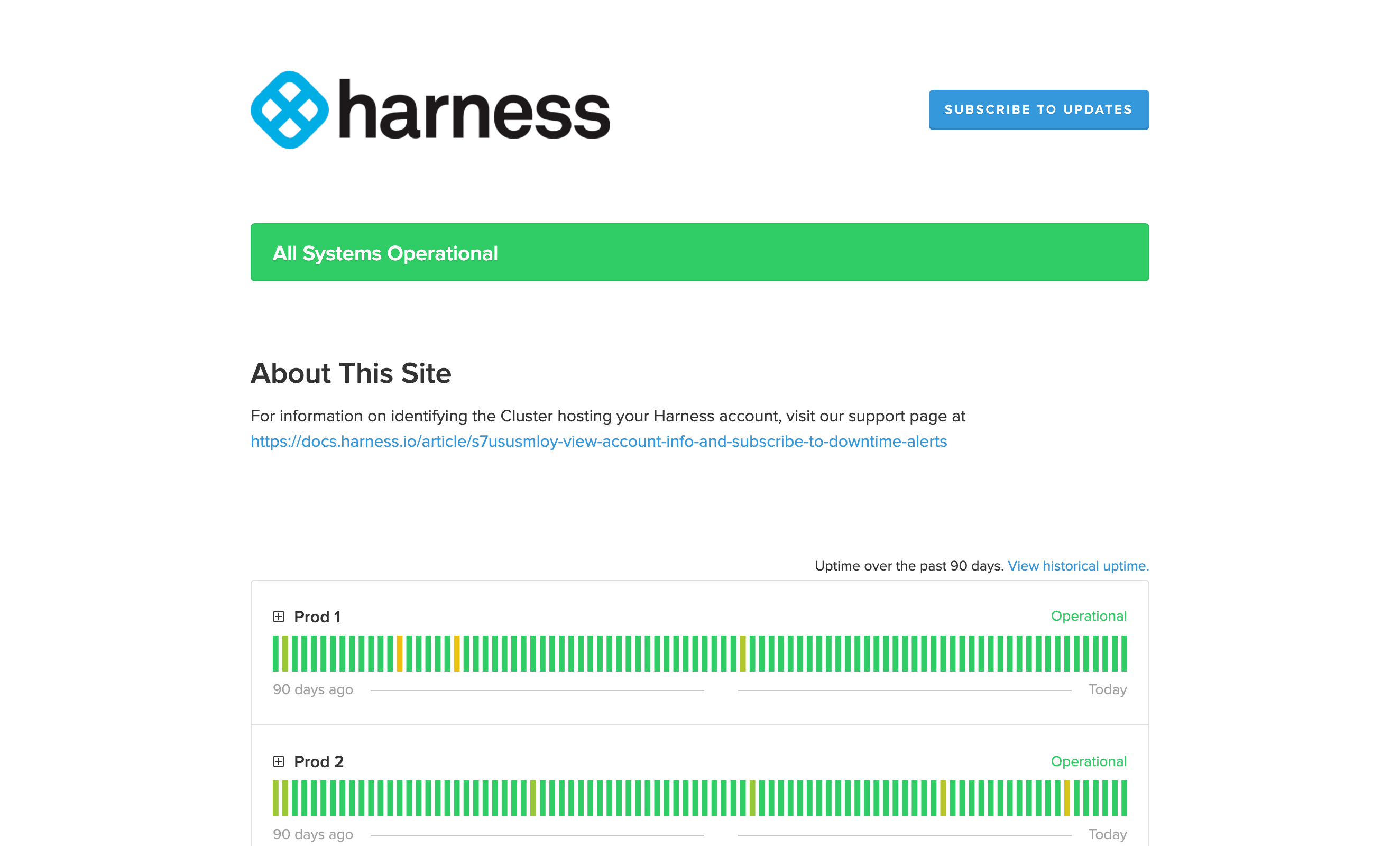 In Harness, select Help, and then select Site Status. The status page shows the operational status of the SaaS cluster hosting your account.