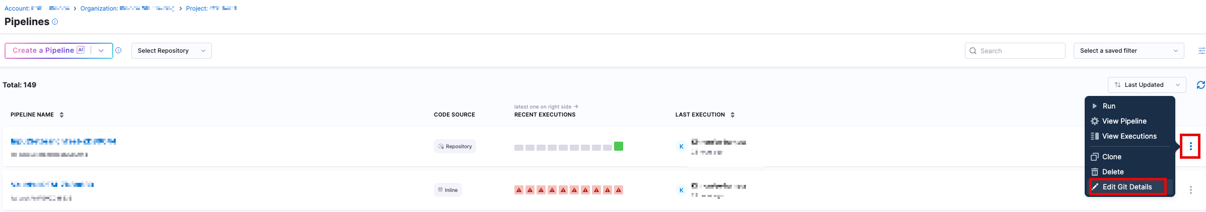 - Click on the three dots (...)at the side of the appropriate pipeline. SelectEdit Git Details