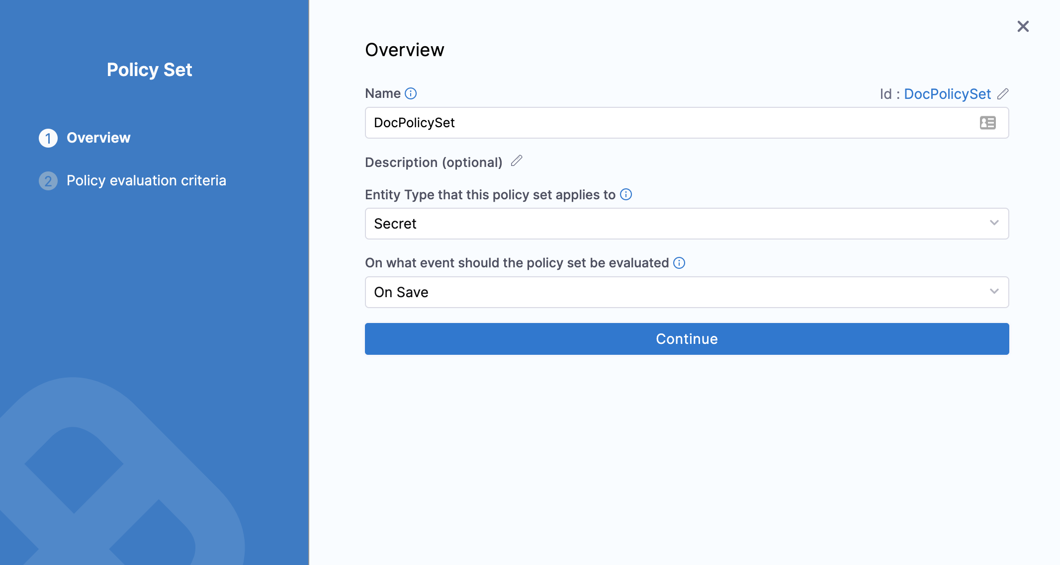 - Warn & continue - You will receive a warning if the policy is not met when the Secret is evaluated, but the Secret will be saved and you may proceed.