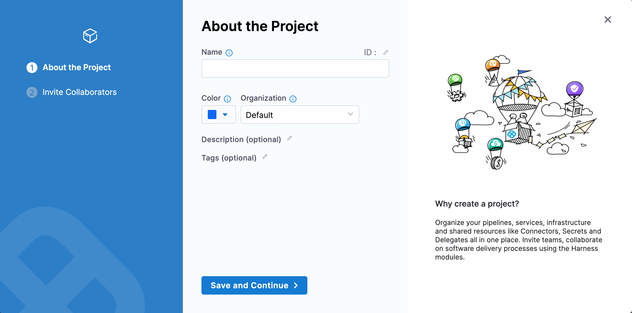 In Invite Collaborators, click Save and Continue. You automatically be added as a Project Admin.