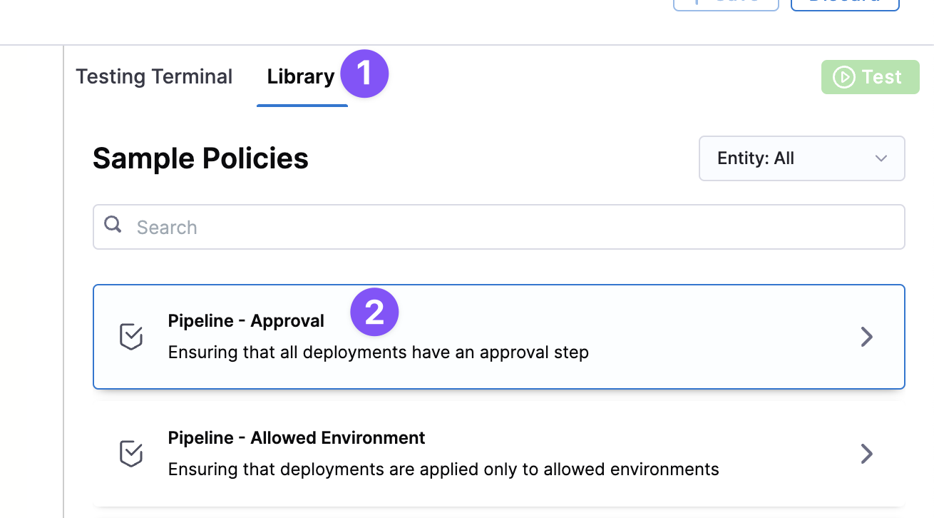 In this step, we'll quickly review a Rego policy, add the policy in Harness, and then test our Pipeline using the policy.
