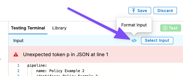 Since Input only uses JSON and we pasted in YAML, you will see an error like Unexpected token p in JSON at line 1.