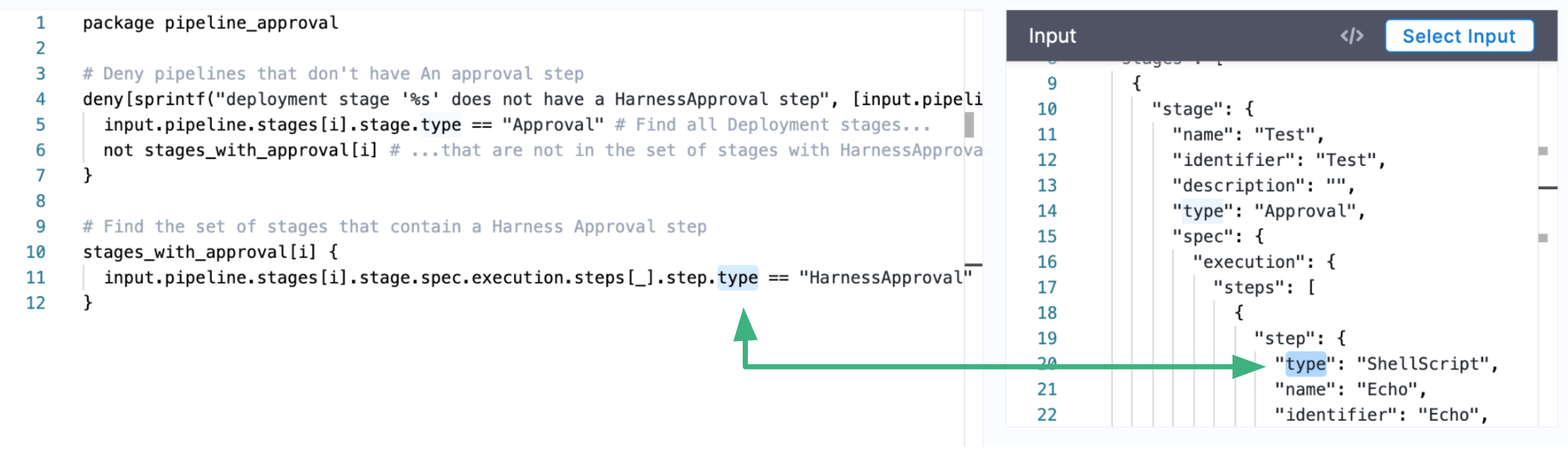 Basically, this policy checks whether a Pipeline has an Approval stage containing Approval steps. If the Pipeline does not, then the policy deny is enforced.