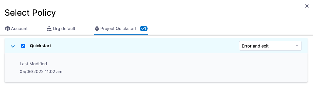 In Select Policy, click Project Quickstart, and select the Quickstart policy you created.