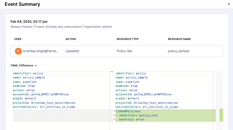 You can view YAML difference when updates are made to policy and policy set within Audit Trail.