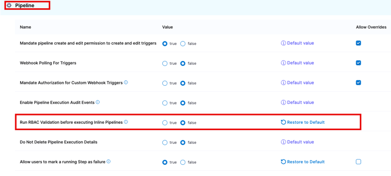 The Run RBAC Validation before executing Inline Pipelines setting is available in the account-level default settings.