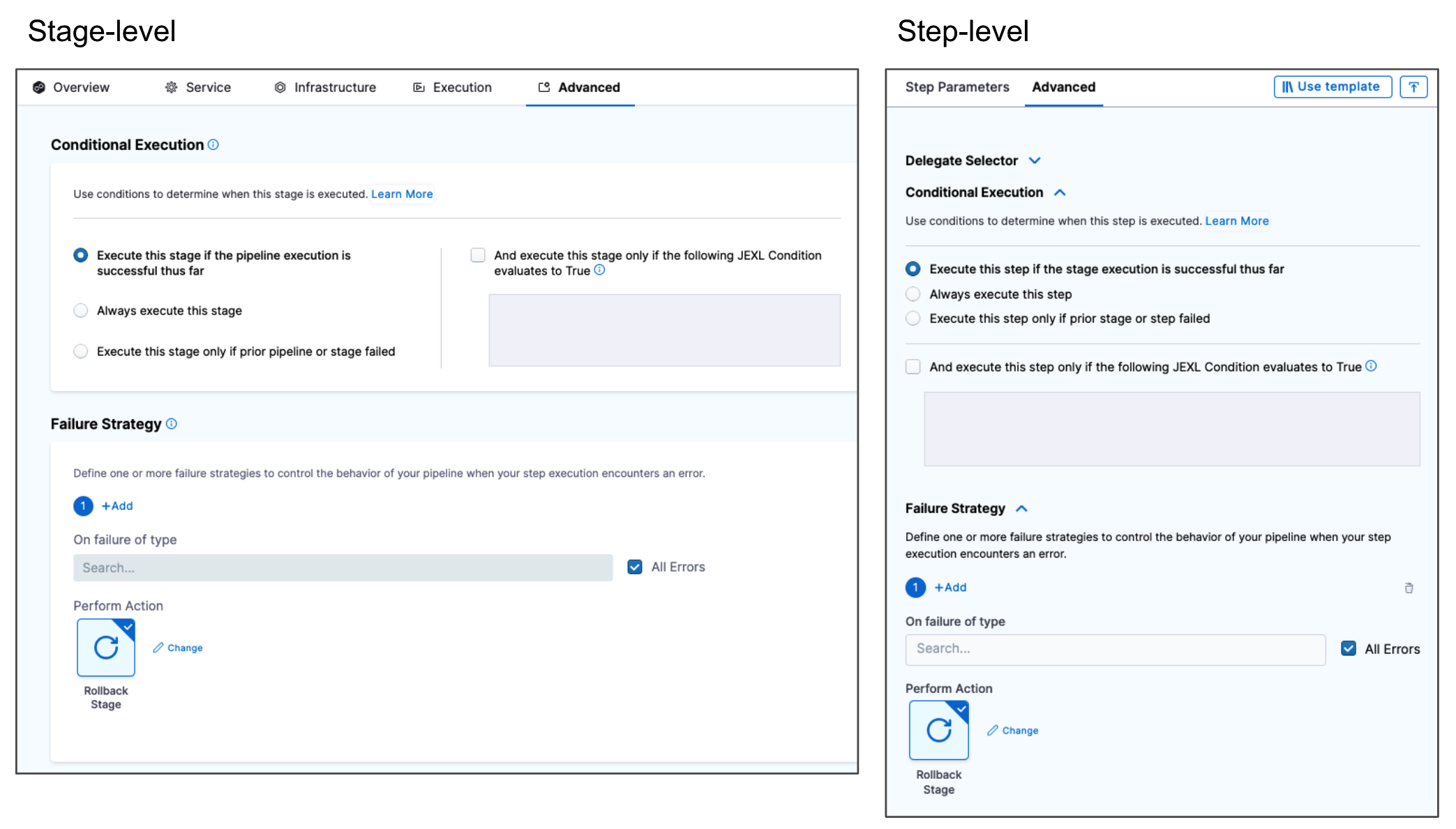 - Stages: A stage's conditional execution settings apply to all steps in that stage that don't have their own step-level conditional execution settings.