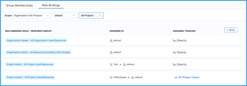 Review the role bindings. The Assigned Through column indicates the source of the role binding. Assignments are either Direct or inherited from a user group. If inherited, the user group name is listed. The Assigned At column indicates the scope at which the assignment was made. If assigned at an organization or project scope, the organization and project name are listed.