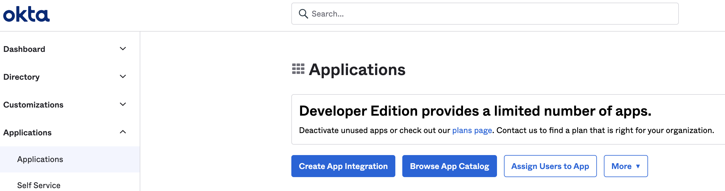 1. Log in to your Okta administrator account, select Applications, and select Create App Integration.
