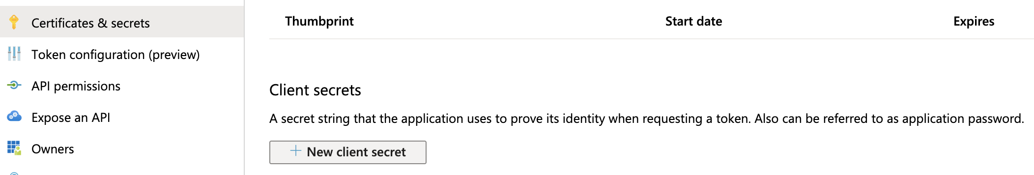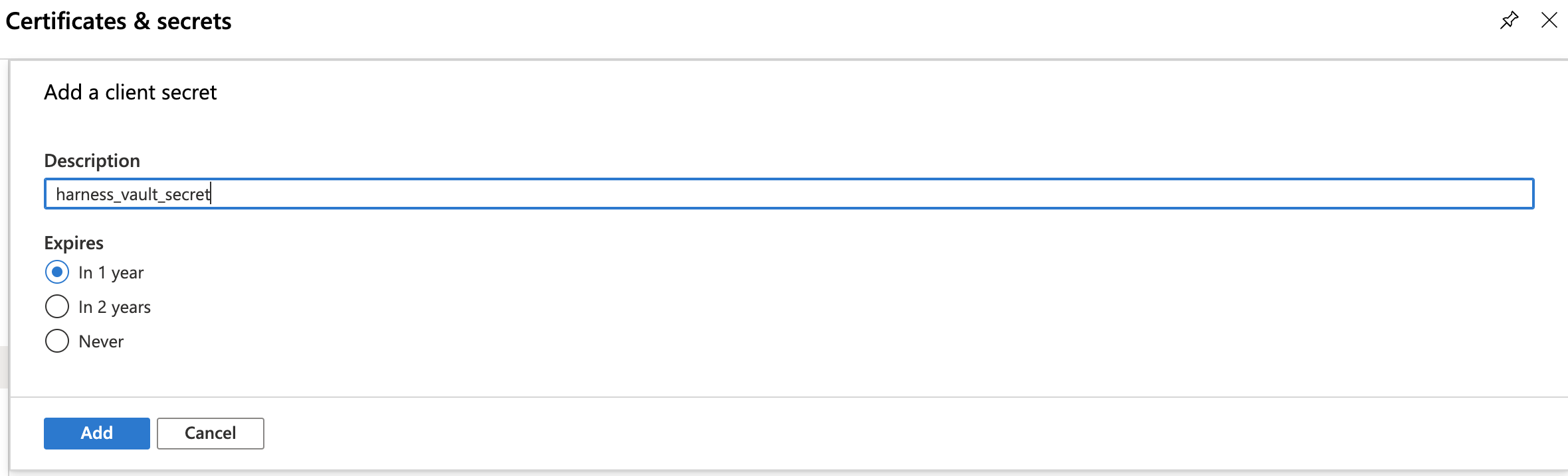 In Key, select Create or Select a Secret. For detailed steps on creating a new secret, go to Add Text Secrets.  The secret that you reference here should have the Azure authentication key as the Secret Value. To create and exchange the azure authentication key, follow these steps: - Navigate to Azure's Certificates & secrets page. (For details, go to Microsoft Azure's Create a new application secret documentation.)