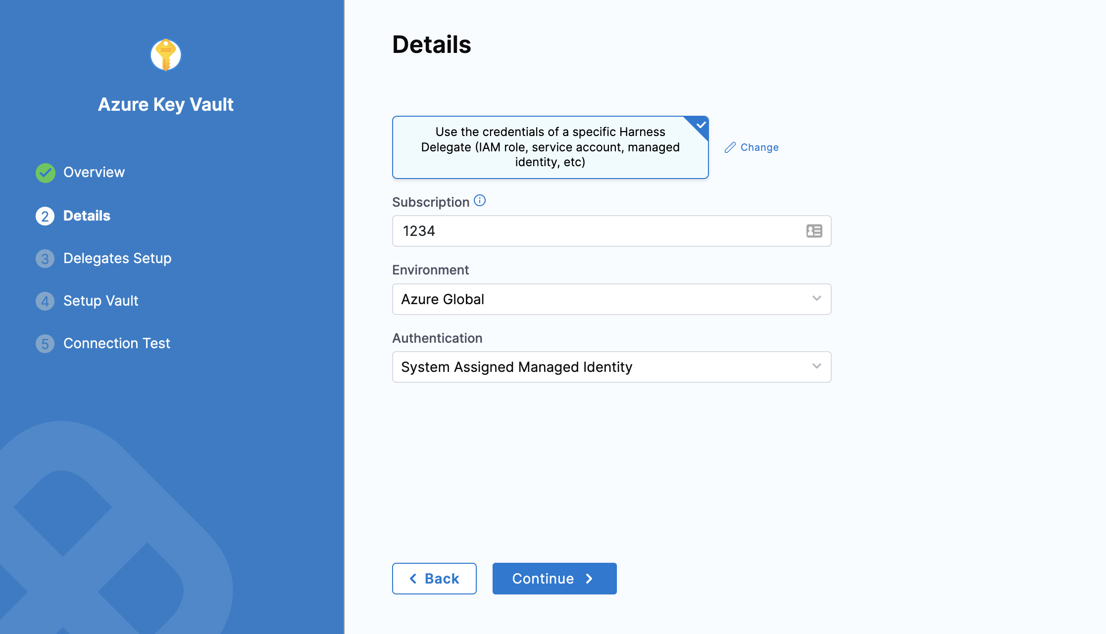 - Select Use the credentials of a specific Harness Delegate (IAM role, service account, managed identity, etc).