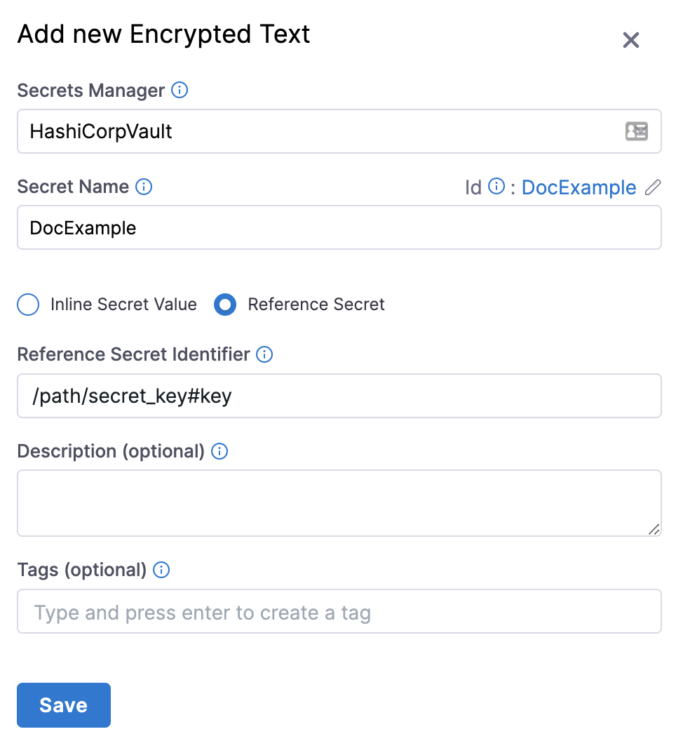 For HashiCorp Vault, you can also use expressions to reference pre-existing secrets in Vault using a fully-qualified path, such as hashicorpvault://LocalVault/foo/bar/mysecret#mykey.