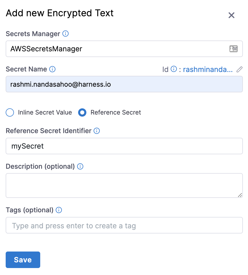 You can create a Harness secret that refers to an existing secret in AWS Secrets Manager using the name of the secret, and a prefix if needed. For example, mySecret.