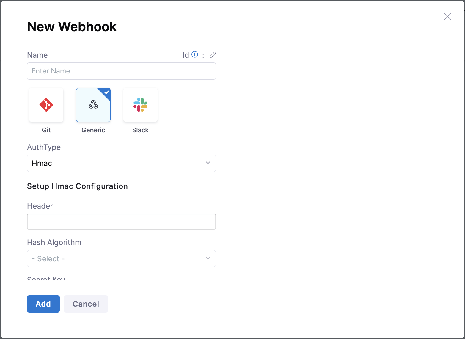 • HMAC: For Hash-Based Message Authentication Code authentication. To set up HMAC Authentication, provide the following details: Header, Hash Algorithm, and Secret Key.