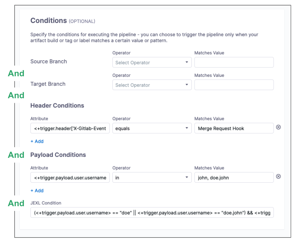 jexlCondition: (<+trigger.payload.user.username> == "doe" || <+trigger.payload.user.username> == "doe.john") && <+trigger.header['X-Gitlab-Event']> == "Merge Request Hook"
