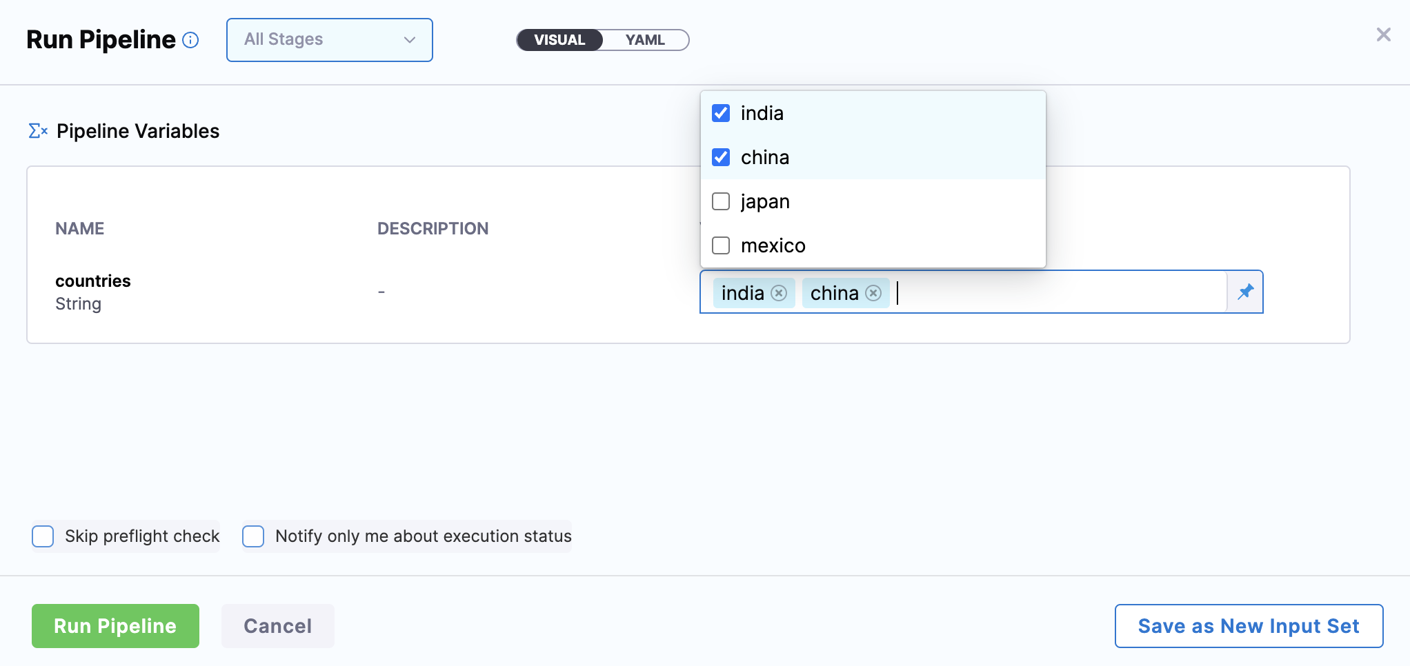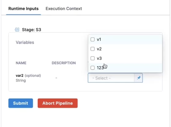 - Select mid-run input from a list of allowed values: <+input>.allowedValues(value1,value2).executionInput()