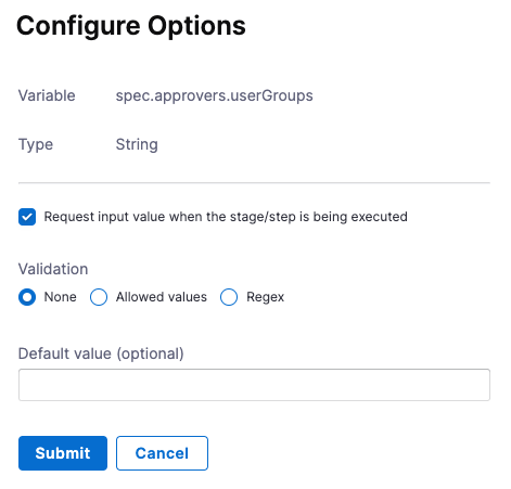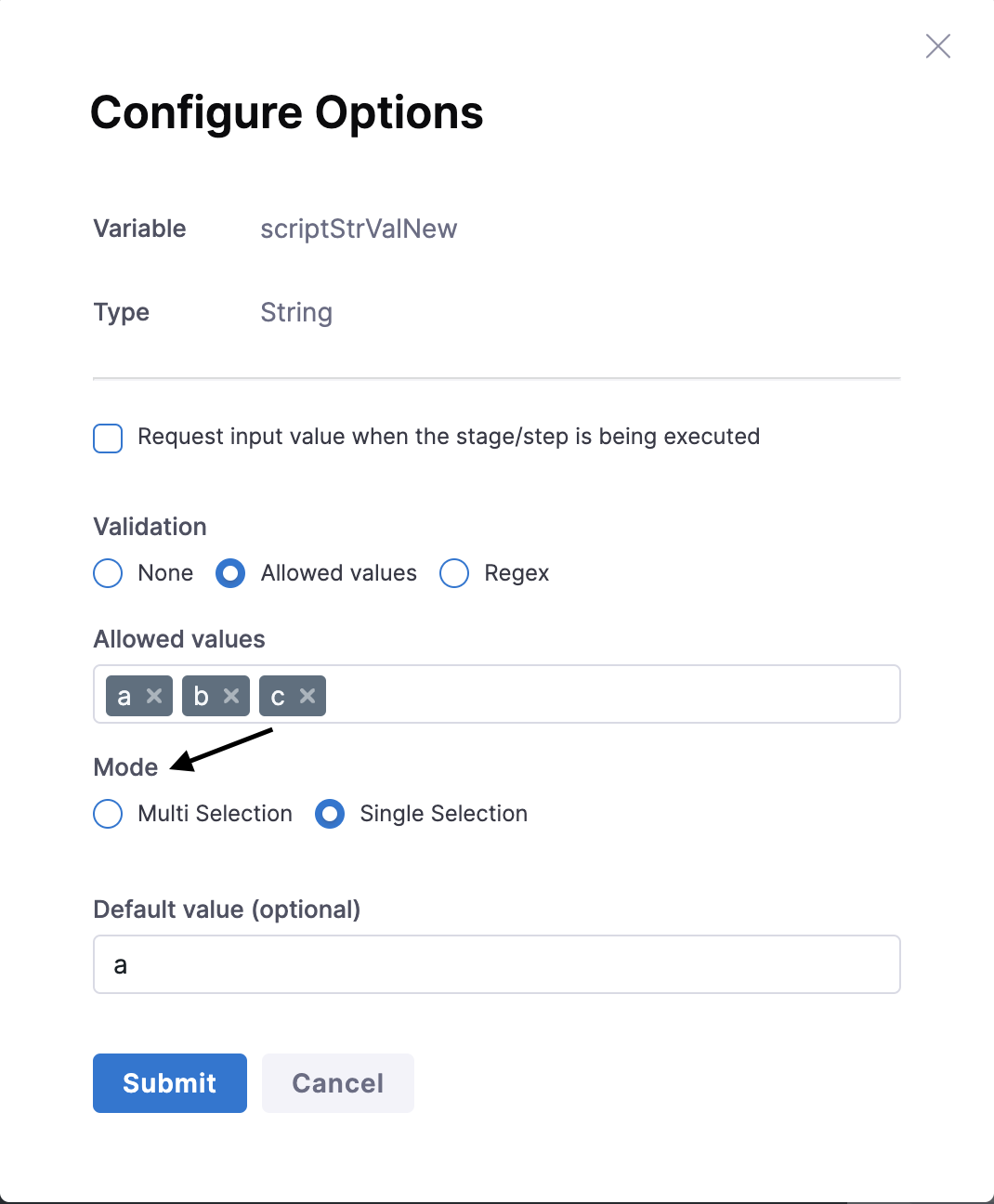 - Provide a default value and provide a list of allowed values for mid-run input: <+input>.allowedValues(value1,value2).default(value1).executionInput()
