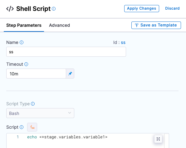 The expression <+pipeline.stages.custom_1.spec.execution.steps.ShellScript_1.output.outputVariables.name> resolved to "123".