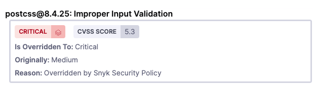 With the Snyk Step, or a Custom Scan Step utilizing a self installed Snyk runner, you can configure Harness to utilize the severity scores in a Snyk Enterprise security policy, and provide an override severity for an issue.  This can be adjusted from your Snyk results, or it can also come from the snyk CLI. You can see this information in Issue Details.