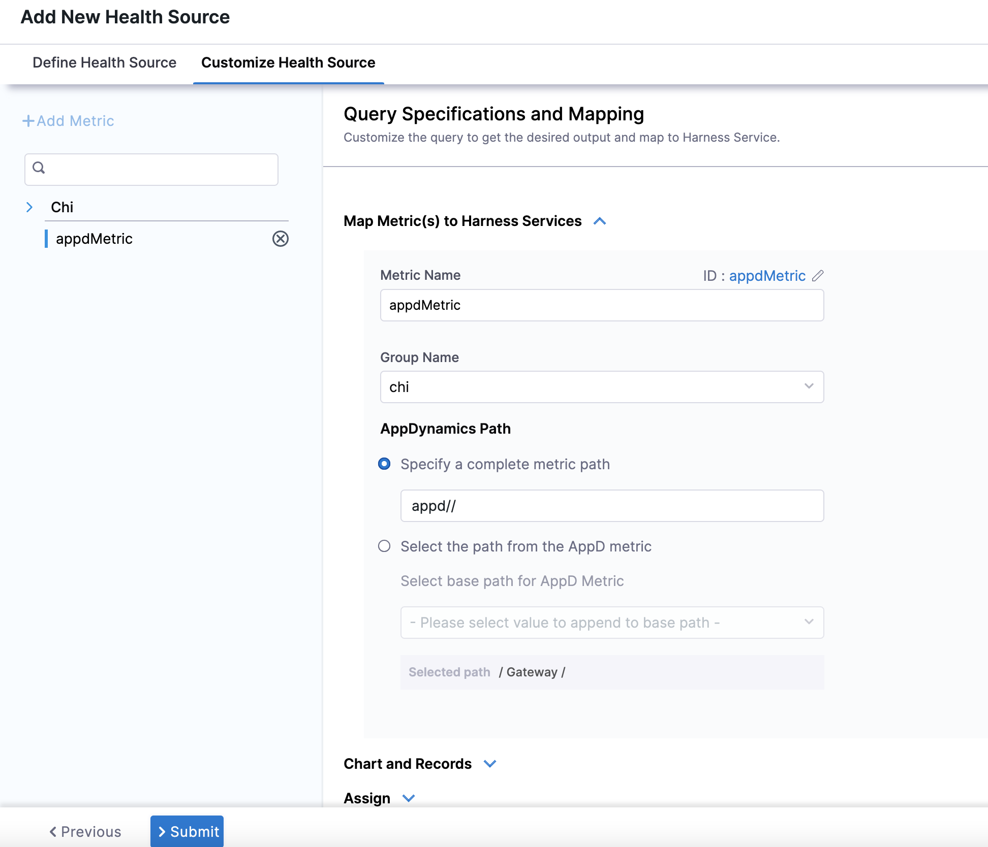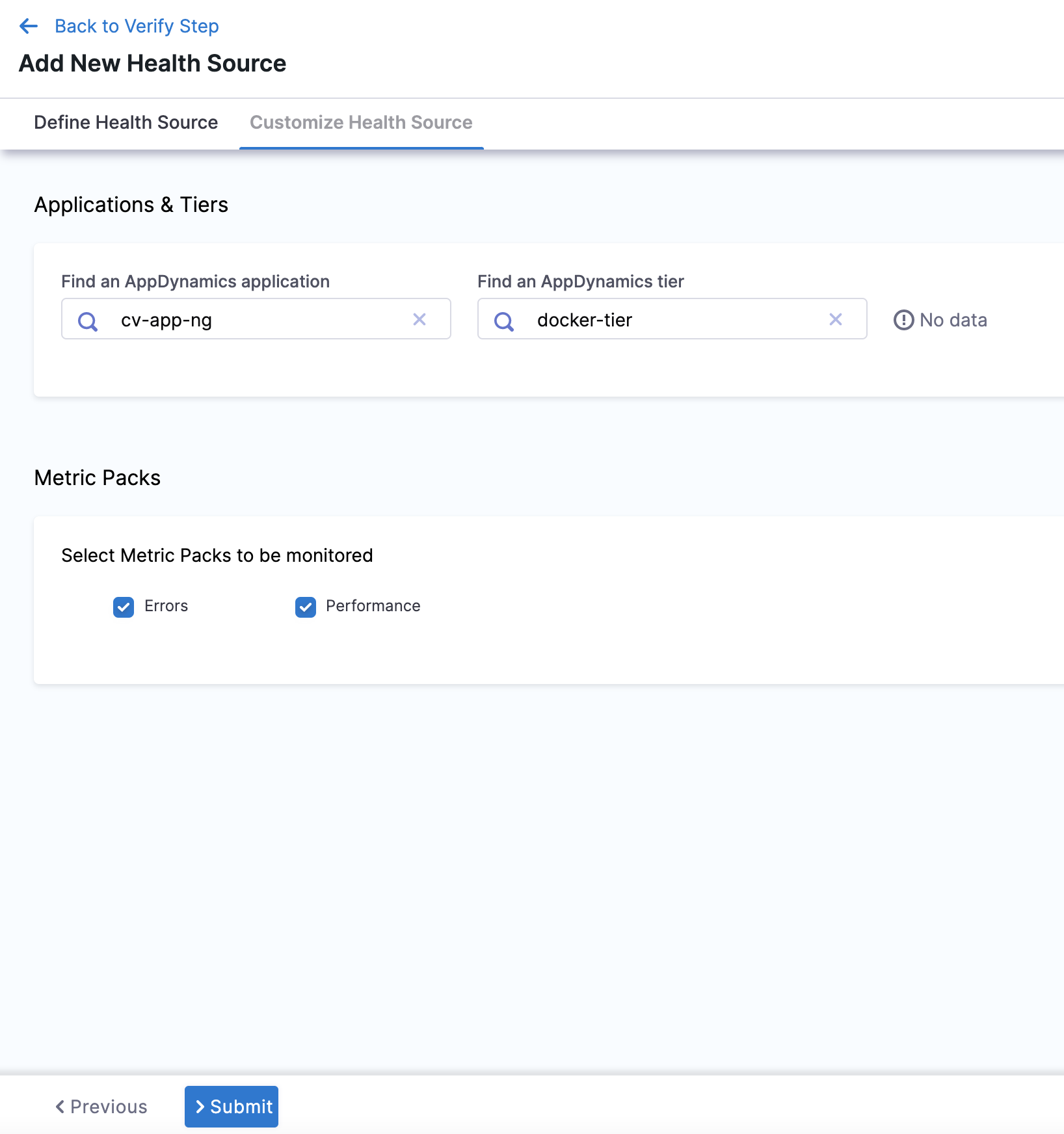 The subsequent settings in Customize Health Source depend on the Health Source Type you selected. You can customize the metrics to map the Harness Service to the monitored environment. In Applications & Tiers, enter the following details: