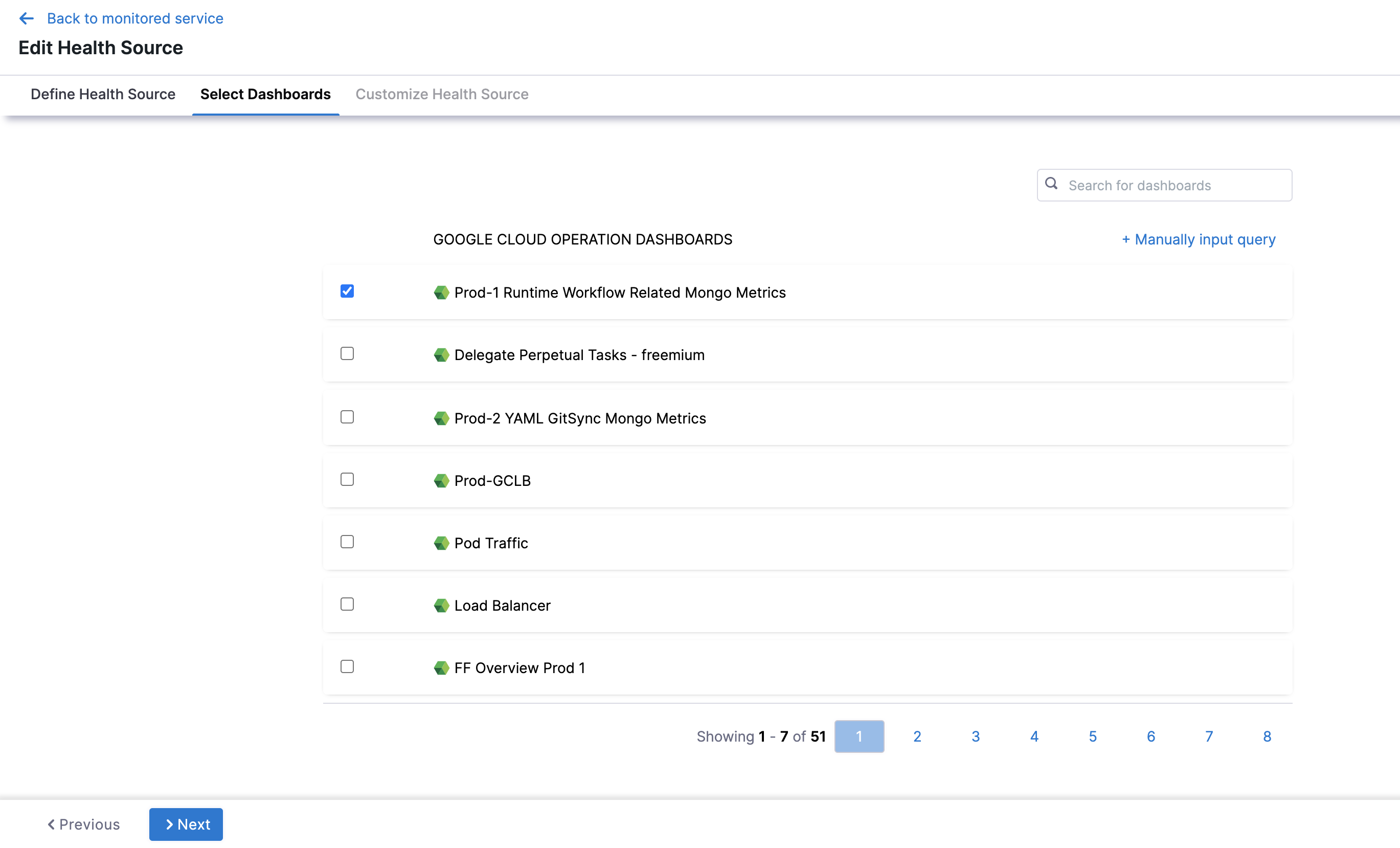 Click one or more dashboards from the displayed results. If you don't have any preexisting dashboards or don't want to select the ones in the displayed result, click Manually input query.