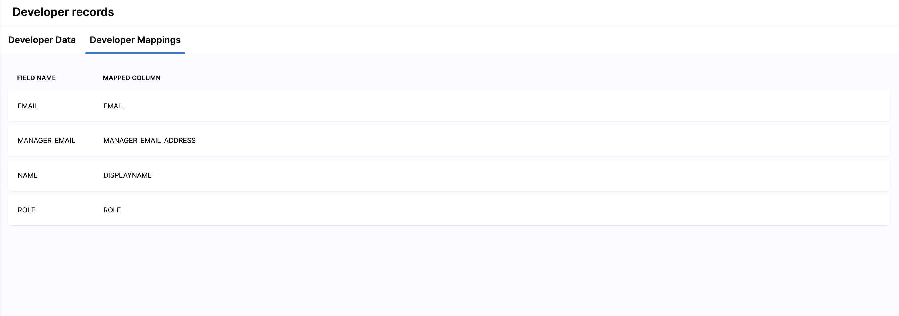 Accurate mappings are essential for ensuring developer records are correctly associated with roles, managers, and team assignments. Field mappings are available on the Developer Mappings tab. You can access these mappings to ensure that the fields from the uploaded CSV file are correctly mapped to SEI's schema.