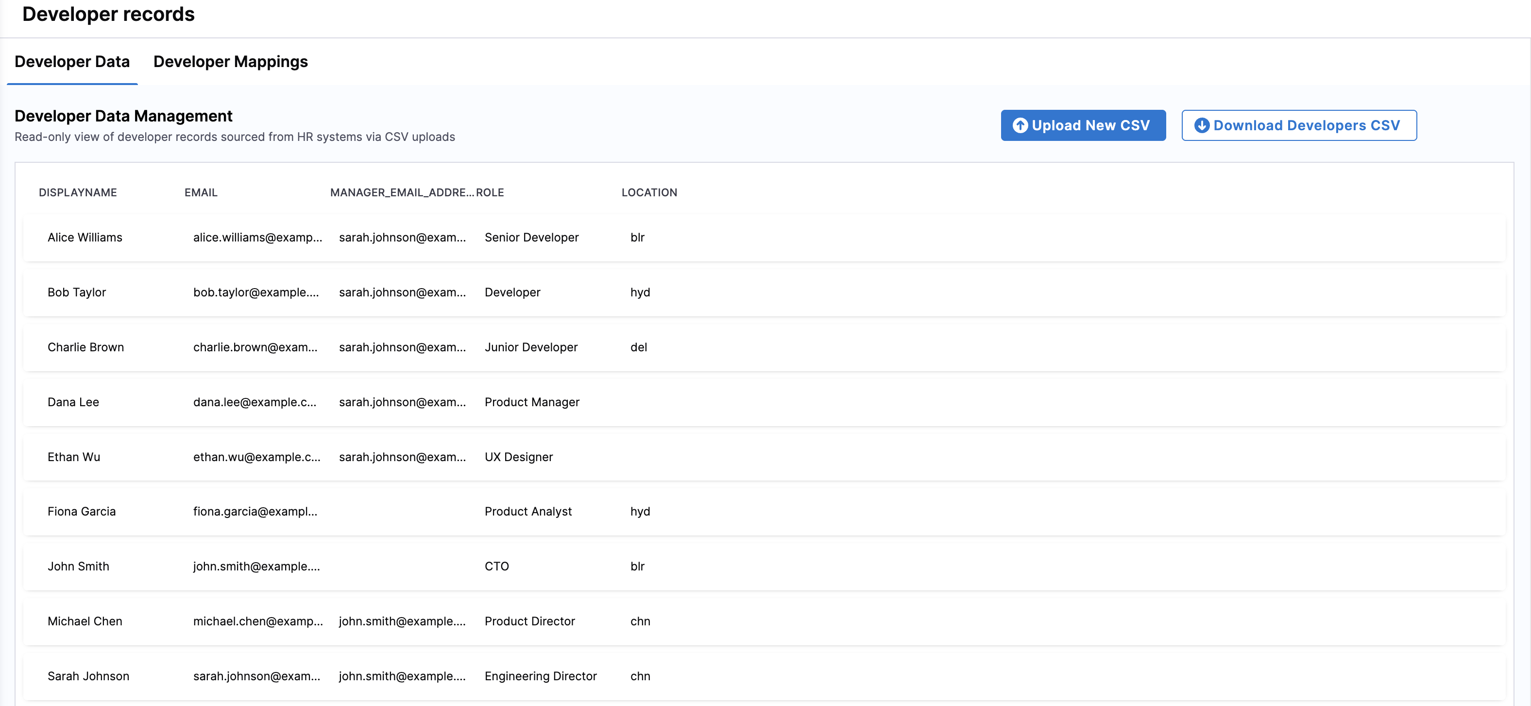 Managing developer records in SEI 2.0 ensures accurate mapping of individuals to their respective teams, roles, and reporting structures. This includes uploading new developer records, reviewing records sourced from HR systems, and mapping relevant fields to SEI's schema.